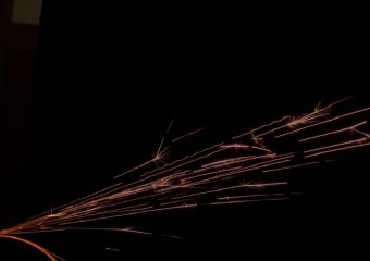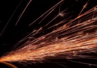 鋼材をグラインダーで削り火花を発生させ、色と形状から材料判別を実施します。